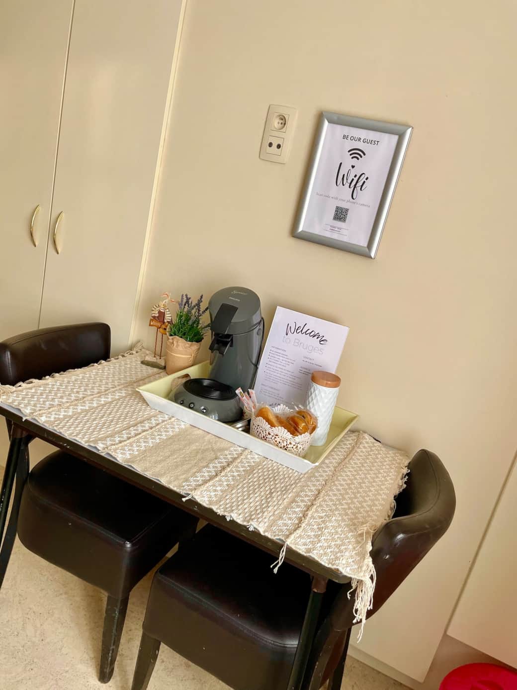 Coffee machine, Microwave, Refrigerator, Coffee, Dining table, Dishes and silverware, Mini fridge, Hot water kettle, Wine glasses